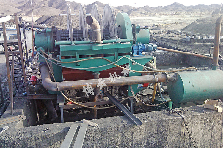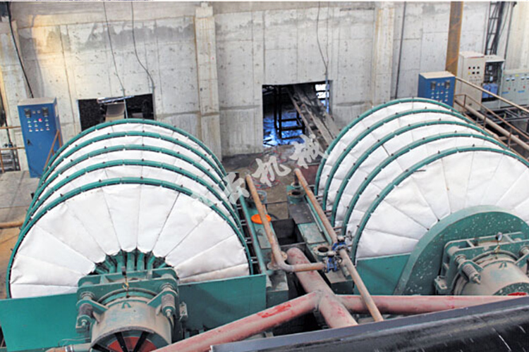 盤式真空過濾機由各個單獨的扇形片的圓盤構成。每一個扇形片為單獨的過濾單元,由濾布做成布套在扇形片上形成濾室。過濾盤由電機通過減速器及開式齒輪傳動來驅動,過濾盤順時針方向轉動,濾室里的礦漿在吸附區(qū)借助于真空泵在過濾介質(zhì)兩側形成的壓力差,附著在過濾盤上形成濾餅后,攪拌器旋轉防止固體沉淀,濾餅離開液面后,在真空作用下繼續(xù)脫去水分。濾液透過濾布,經(jīng)過濾液管,從分配頭排出。濾餅在卸料區(qū)由反吹風卸料落入排料槽,整個作業(yè)過程連續(xù)循環(huán)進行。